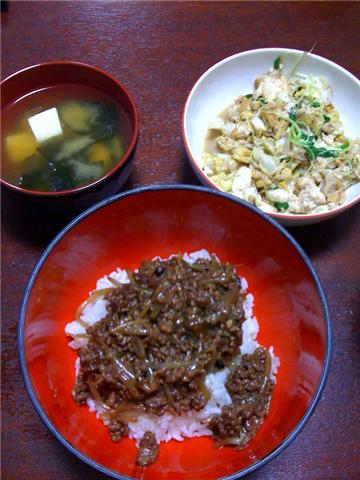 昨日つくった料理。 もやしとひき肉丼・豆腐とキャベツのチャンプルー・豆腐とわかめのお味噌汁。 丼は彩りがないのでちょっと写真向きじゃないです 上に水菜とかのっけたらよかったかなぁ・・・ それと残りの2品は彼氏さんが作ってくれました。 昔からお料理していたらしく手際が良いんですよ
