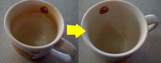 毎日スポンジと中性洗剤で洗ってもとれなかったのに、このアクリルたわしと水だけで